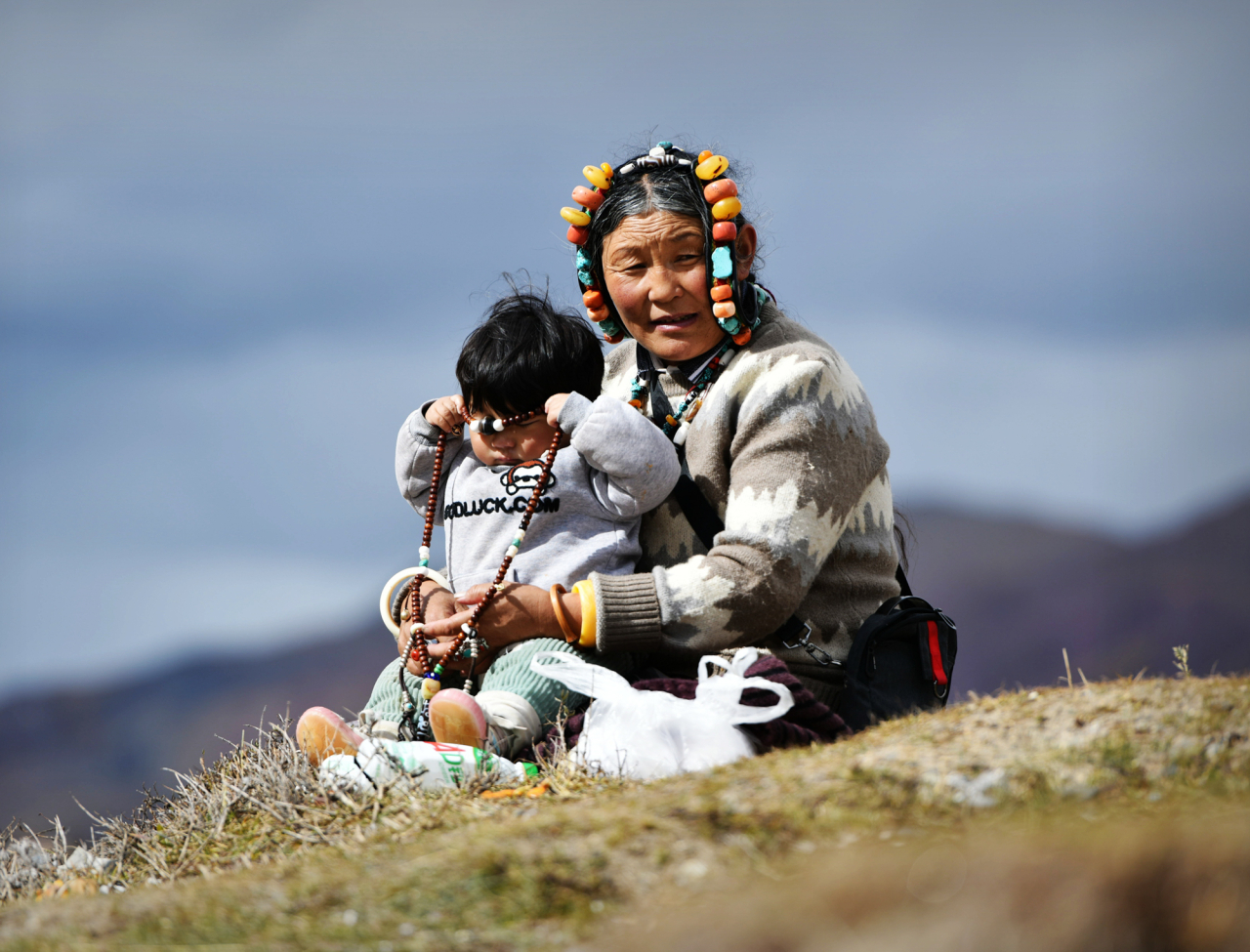 A grandmother in China rests on a hillside with her granddaughter in her arms, holding Buddha beads that glisten softly in the sun as symbols of fortune and faith. Culture and tradition are passed gently from one generation to the next, as they have been for centuries along the Silk Roads, where Buddhism continues to shape the spiritual life of communities.